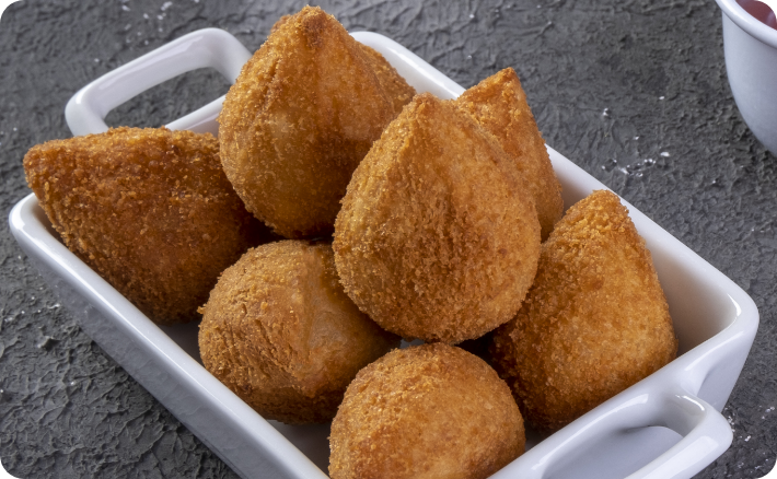 Empanamento com produtos de alta tecnologia italiana com 70% menos absorção de gorduras na fritura.