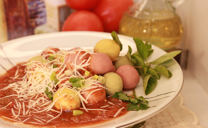 Nhoque de vegetais frescos e selecionados, cenouras, beterrabas e espinafres.